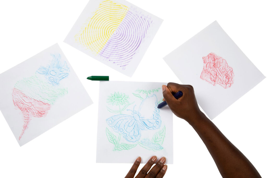 What supplies do I need? Just paper and a crayon or colored pencil — nothing else required. Thinner paper picks up texture more vividly. Unwrapped crayons held sideways give the smoothest, most even coverage, though pencils and oil pastels work beautifully too.