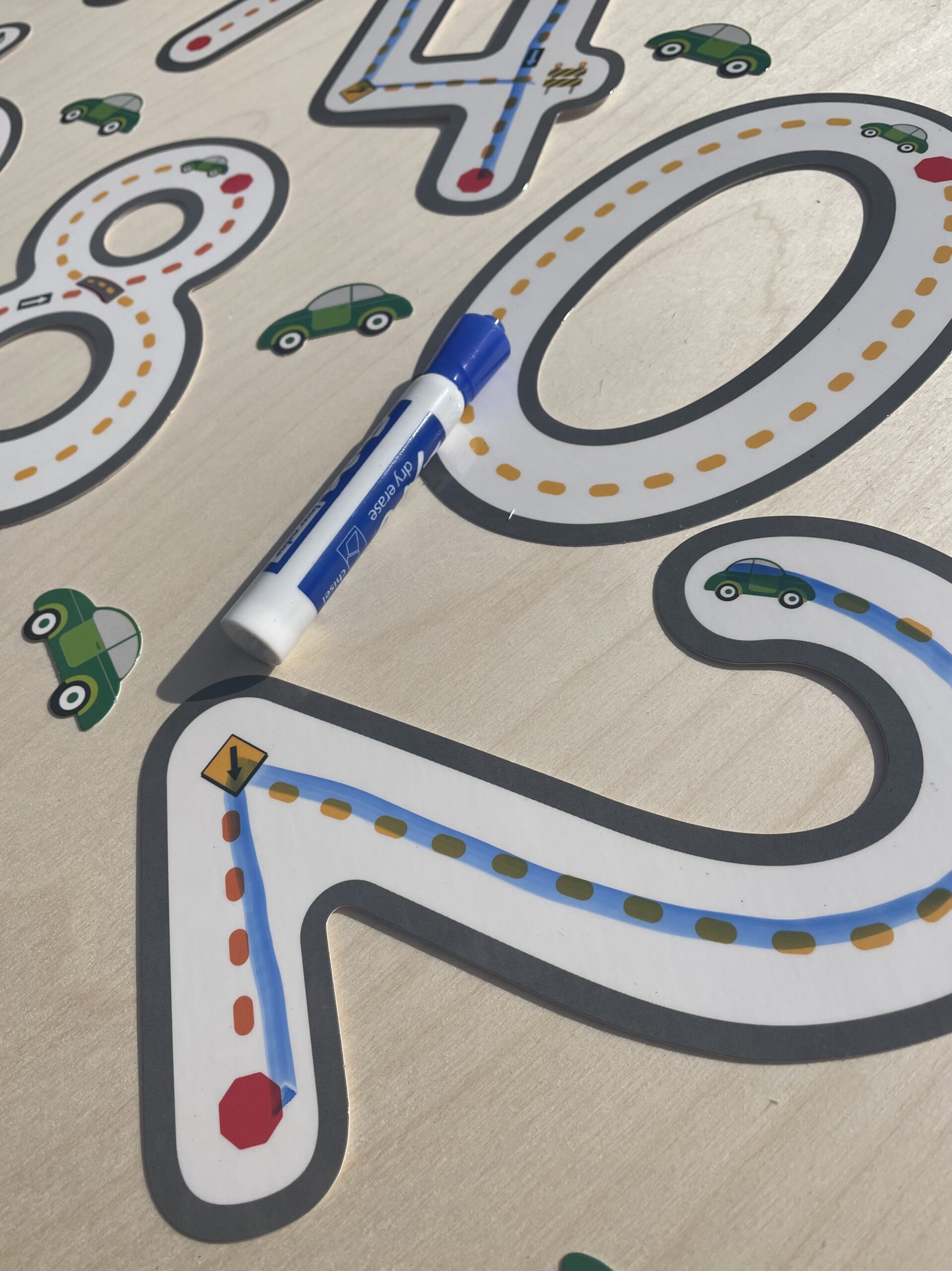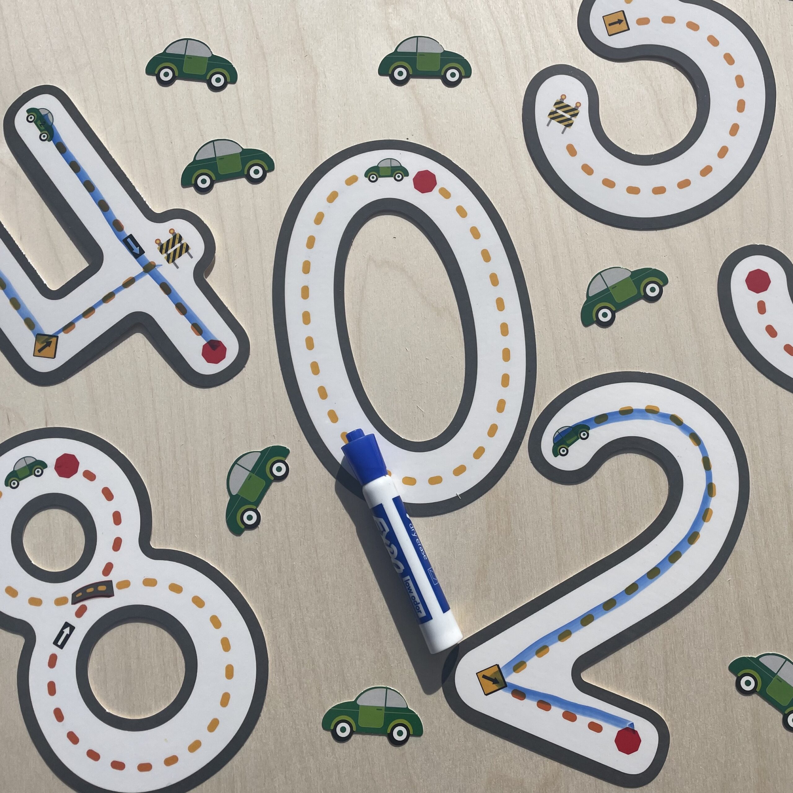 Each card features a bold numeral paired with fun, road-inspired graphics, including printed cars that children use to “drive” along the shape of each number. As learners trace the numerals, they strengthen fine motor skills, hand-eye coordination, and proper number formation—all while staying actively engaged. The visual cues and motion-based tracing help children connect physical movement with math concepts, making learning more intuitive and memorable.